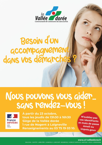 Accompagnement dans vos démarches administratives La Communauté de Communes La Vallée dorée renforce son accompagnement dans vos démarches administratives grâce à deux nouveaux créneaux France services accessibles gratuitement et sans rendez-vous. À Laigneville Siège de la Vallée dorée – 1 rue de Nogent À partir du 23 octobre, tous les jeudis de 13h30 à 16h30 Renseignements au 03 75 19 03 10 À Liancourt Mairie de Liancourt – 232 rue Jules Michelet À partir du 15 octobre, tous les mercredis de 9h à 12h Renseignements au 03 75 19 03 10 Les conseillers France services vous accompagnent dans vos démarches administratives en ligne (Ameli, impots.gouv, CAF, Pôle emploi, etc.). Pensez à vous munir de vos identifiants et mots de passe. Gratuit et sans rendez-vous – un service de proximité pour tous les habitants de la Vallée dorée. Plus d’informations sur www.ccl-valleedoree.fr Publié le 06/10/2025