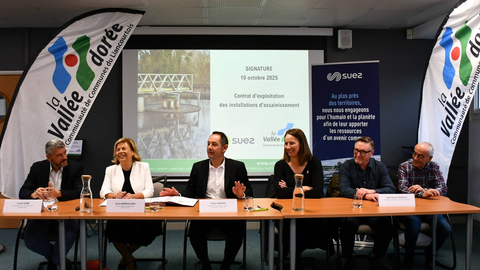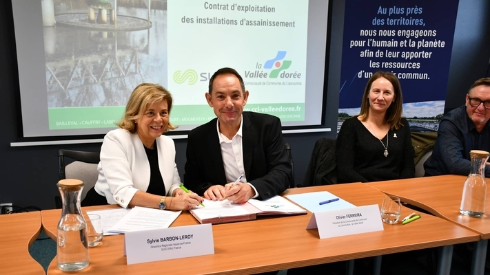Un nouveau chapitre pour la gestion de l’assainissement sur notre territoire La Communauté de communes du Liancourtois – La Vallée Dorée et SUEZ ont signé un partenariat de 6 ans pour la gestion du service public d’assainissement collectif et pluvial du territoire. Ce nouveau contrat marque une étape clé pour renforcer la performance des installations, tout en réduisant leur impact environnemental et en améliorant la qualité du service rendu aux habitants. Des innovations au service de la performance environnementale Conçu en cohérence avec les objectifs de développement durable du territoire, le contrat intègre plusieurs innovations technologiques majeures : Hypervision Aquadvanced Assainissement : pilotage en temps réel des réseaux pour anticiper les incidents. Optimisation de l’aération et du pompage : jusqu’à –20 % de consommation d’électricité. Capteurs connectés et intelligence artificielle : surveillance continue pour prévenir les pollutions. SewerBall : technologie exclusive SUEZ permettant de détecter les infiltrations et rejets polluants dans les réseaux. Curage automatisé du bassin d’orage : utilisation d’eau industrielle en substitution de l’eau potable, réduisant la consommation et le nombre d’interventions. Ces solutions permettront une réduction mesurable des émissions de CO₂, une consommation énergétique optimisée et un suivi plus transparent et fiable du fonctionnement des ouvrages. Un engagement partagé en faveur de la transition écologique "Ce partenariat avec SUEZ nous aidera à mieux maîtriser nos coûts et à réagir rapidement aux dysfonctionnements, grâce à des outils innovants. Il s’inscrit dans notre politique environnementale et dans l’accompagnement à la transition écologique de notre territoire." - Olivier Ferreira, Président de la Communauté de Communes du Liancourtois – La Vallée Dorée "Ce partenariat illustre pleinement notre ambition régionale : accompagner les territoires dans la gestion durable des services essentiels, en conjuguant proximité et innovation." - Sylvie Barbon-Leroy, Directrice Régionale Hauts-de-France de SUEZ Eau Ce partenariat illustre la volonté commune de la Communauté de communes du Liancourtois – La Vallée Dorée et de SUEZ de conjuguer performance technique, innovation et transition écologique, au service des habitants et des générations futures. Une collaboration au service du territoire et de ses habitants Cette signature s’est déroulée en présence de : Olivier Ferreira, Président de la Communauté de communes du Liancourtois – La Vallée Dorée Sylvie Barbon-Leroy, Directrice Régionale Hauts-de-France de SUEZ Eau Laurent Isoré, Directeur Agence Oise-Nord-Ile-de-France de SUEZ Eau Jean-François Croisille, Vice-président en charge de la commission environnement Laëtitia Coquelle, Maire de Liancourt Patrick Davenne, Conseiller communautaire et premier adjoint de Rantigny Publié le 10/10/2025