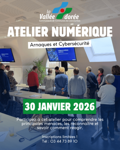 Culture - Liancourt Date Le Vendredi 30/01/2026 - 09h30 La prise en main de l’outil informatique, peut exposer les usagers à des arnaques en ligne. Cet atelier propose un point clair et pratique sur les principales menaces, comment les reconnaître et comment réagir en cas de doute ou de fraude. Au programme : Identifier les mails d’arnaque Comprendre et repérer le phishing (hameçonnage) Apprendre à s’en prémunir avec des gestes simples Savoir réagir si l’on s’est fait piéger (bons réflexes et démarches) Vendredi 30 janvier 2026 9h30 – 11h30 Maison des Associations – 22 rue des Arts et Métiers, Liancourt Inscriptions limitées : 03 44 73 89 10 Lieu Maison des Associations 22 rue des Arts et Métiers 60140 Liancourt France