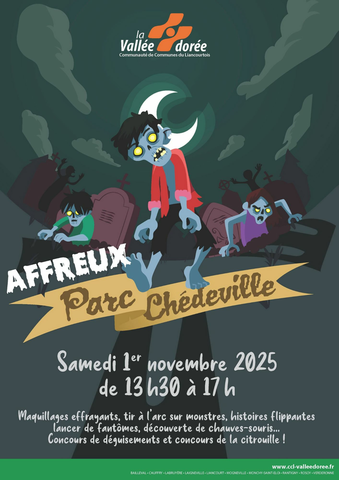 Parc Chédeville - Mogneville Date Le Samedi 01/11/2025 - 13h30 Frissons et rires au rendez-vous Le Parc Chédeville vous invite à une journée monstrueusement amusante, samedi 1er novembre 2025, de 13h30 à 17h, au 10 rue de la Brèche à Mogneville. Préparez vos déguisements et venez partager un moment magique en famille. Au programme : Contes d’Halloween (14h et 15h) Venez écouter les histoires de monstres et de sorcières, adaptées aux enfants selon leur âge. Chasse aux fantômes (13h30–16h) Scannez les QR codes, résolvez les énigmes et découvrez la phrase mystère… une surprise vous attend à l’accueil. Maquillages terrifiants (13h30–16h) Choisissez votre modèle et révélez votre côté monstrueux. Concours de déguisements (défilé à 16h) Deux catégories : 3–6 ans et 6–12 ans. Qui séduira le jury ? Tir à l’arc spécial chasse aux monstres (13h30–16h) Montrez vos talents et repartez peut-être avec une surprise. Le poids de la citrouille (13h30–17h) Devinez le bon poids et remportez la citrouille pour cuisiner de délicieux plats d’automne. De drôles de petites bêtes… (13h30–16h) Découvrez le monde fascinant des chauves-souris. Jeux d’adresse : lancer de fantômes et chapeaux de sorcières Une journée magique, effrayante et pleine de rires pour petits et grands. Venez déguisés et partagez la magie d’Halloween au Parc Chédeville ! Parc Chédeville Lieu France