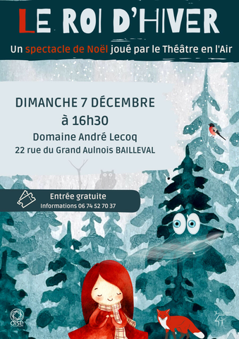 Culture - Bailleval Date Le Dimanche 07/12/2025 - 16h30 Spectacle de Noël pour enfants Dimanche 7 décembre 2025 à 16h30, venez découvrir le spectacle de Noël pour enfants "Le Roi d'Hiver" joué par le Théâtre en l'Air à la salle des glaces du Domaine André Lecoq. "Dans un arbre en pleine forêt, Le Roi d’Hiver s’est installé avec l’esprit du froid, son compagnon de route. Il se sent seul. Tout le monde semble fuir ses attraits : le vent glacé, la neige blanche, le givre étincelant n’amusent plus personne. Pour se venger, le Roi d’Hiver pétrifie en statue de glace ceux qui se plaignent de lui. Son amie la sorcière lui donne alors une leçon de vie…qui lui redonne vie !" Entrée gratuite Informations : 06 74 52 70 37 Lieu Salle des glaces du domaine André Lecoq 22 rue du grand Aulnois 60140 Bailleval France