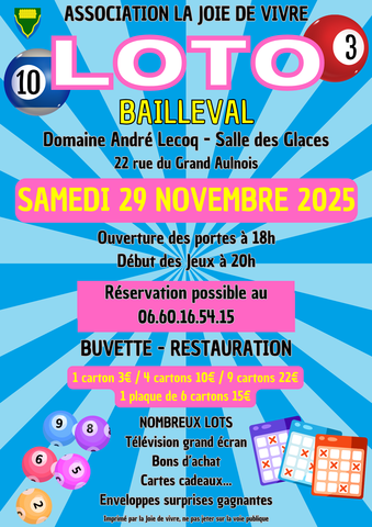 Fêtes et manifestations - Bailleval Date Le Samedi 29/11/2025 - 20h00 L'association La Joie de Vivre organise le samedi 29 novembre 2025 son traditionnel loto à la salle des glaces du Domaine André Lecoq. Ouverture des portes à 18h - début des jeux à 20h Réservation fortement conseillée au 06 60 16 54 15 Buvette et restauration sur place 1 carton 3 € / 4 cartons 10 € / 9 cartons 22 € / 1 plaque de 6 cartons 15 € Nombreux lots à gagner : télévision, bons d'achat, cartes cadeaux .... Lieu Salle des glaces - Domaine André Lecoq 22 rue du grand Aulnois 60140 Bailleval France