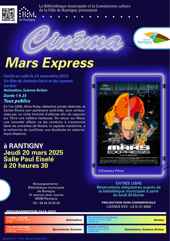 Culture - Rantigny Date Le Jeudi 20/03/2025 - 20h30 Mars Express Un film de Jérémie Périn Sortie en salle le 22 novembre 2023 – durée 1 h 25 Animation, science-fiction, thriller Tous publics Visuellement superbe, le film use d’un réalisme épuré qui brouille sans cesse les pistes entre humains et robots, partageant le même humour au milieu de la mitraille. Jérémie Périn impose, par sa science de l’animation, un épique cyberpolar, qui finit sur un bouleversant exode et par deux questions. C’est quoi être un robot ? Et, en miroir, c’est quoi être humain ? Télérama Il y avait longtemps que l’animation française ne nous avait pas offert un héros aussi fort et un film de science-fiction pour adultes et ados aussi réussi. 20 minutes "Mars Express" prouve la haute tenue de l'animation pour adulte à la française. CinémaTeaser Résumé : En l’an 2200, Aline Ruby, détective privée obstinée, et Carlos Rivera son partenaire androïde sont embauchés par un riche homme d’affaires afin de capturer sur Terre une célèbre hackeuse. De retour sur Mars, une nouvelle affaire va les conduire à s’aventurer dans les entrailles de Noctis, la capitale martienne, à la recherche de Jun Chow, une étudiante en cybernétique disparue. Entrée libre Réservations obligatoires auprès de la bibliothèque municipale à partir du lundi 24 février. Lieu Salle Paul Eiselé 18 rue Marcelin Berthelot 60290 Rantigny France