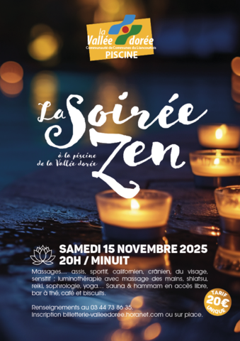 Piscine - Liancourt Date Le Samedi 15/11/2025 - 20h00 Soirée Zen à la piscine : une parenthèse bien-être à ne pas manquer Envie de lâcher prise et de vous accorder un moment de pure détente ? La Soirée Zen revient à la piscine de la Vallée Dorée pour une nouvelle édition placée sous le signe du bien-être et de la sérénité. Samedi 15 novembre 2025, de 20h à minuit, profitez d’un cadre apaisant et d’une atmosphère relaxante pour vous ressourcer le temps d’une soirée hors du temps. Au programme : Accès à l’espace sauna et hammam pour une détente optimale Massages (assis, sportif, californien, crânien, du visage, sensitif), shiatsu, reiki, sophrologie, yoga et luminothérapie avec massage des mains Tisanerie pour savourer une boisson chaude accompagnée de biscuits Tarif : 20 € Inscriptions à partir du 20 octobre dès 10h, à l’accueil de la piscine ou en ligne : https://billetterie-valleedoree.horanet.com (rubrique Soirée Zen) Renseignements : 03 44 73 86 35 À noter : la piscine fermera exceptionnellement ses portes au public à 17h ce jour-là. Piscine Lieu 2 Rue du Général de Gaulle 60140 Liancourt France
